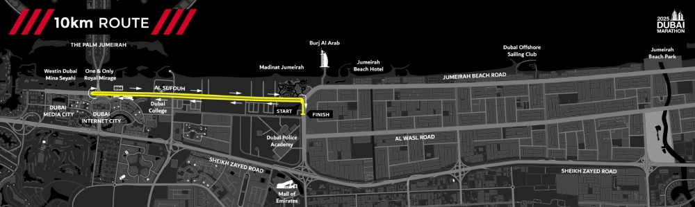 شروع و پایان مسابقات ماراتن و ۱۰ کیلومتر در جاده امسقیم، روبهروی مدینة جمیرا و در مجاورت برجالعرب برگزار میشود. نقطه شروع هر دو مسابقه در انتهای مدینة جمیرا در جاده امسقیم است. مسابقه ۴ کیلومتر از خیابان الصفوح، مقابل مدینة جمیرا آغاز میشود. خط پایان تمامی مسابقات در انتهای جاده امسقیم و مقابل آکادمی پلیس دبی خواهد بود.