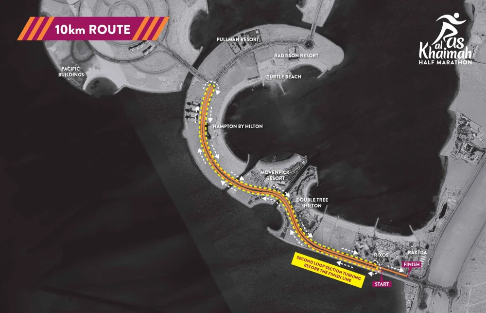 شروع و پایان نیمهماراتن، مسابقات ۱۰ کیلومتر، ۵ کیلومتر و دوی تفریحی ۲ کیلومتر در جزیره المرجان، رأسالخیمه برگزار میشود.